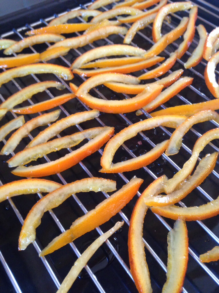 Once the sugar is dissolved add the orange strips to the pan an simmer for another 30 minutes, let it cool in the syrup before placing on an oven preheated to it’s lowest temperature for 30 minutes.