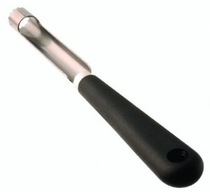 Use any sweet pear you like, cut the stalk and reserve for decoration. Slice the bottom so the pear will stand up and core it with an apple corer.