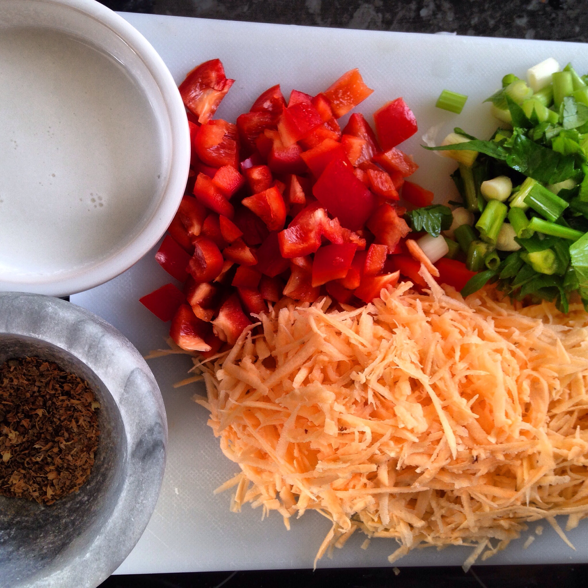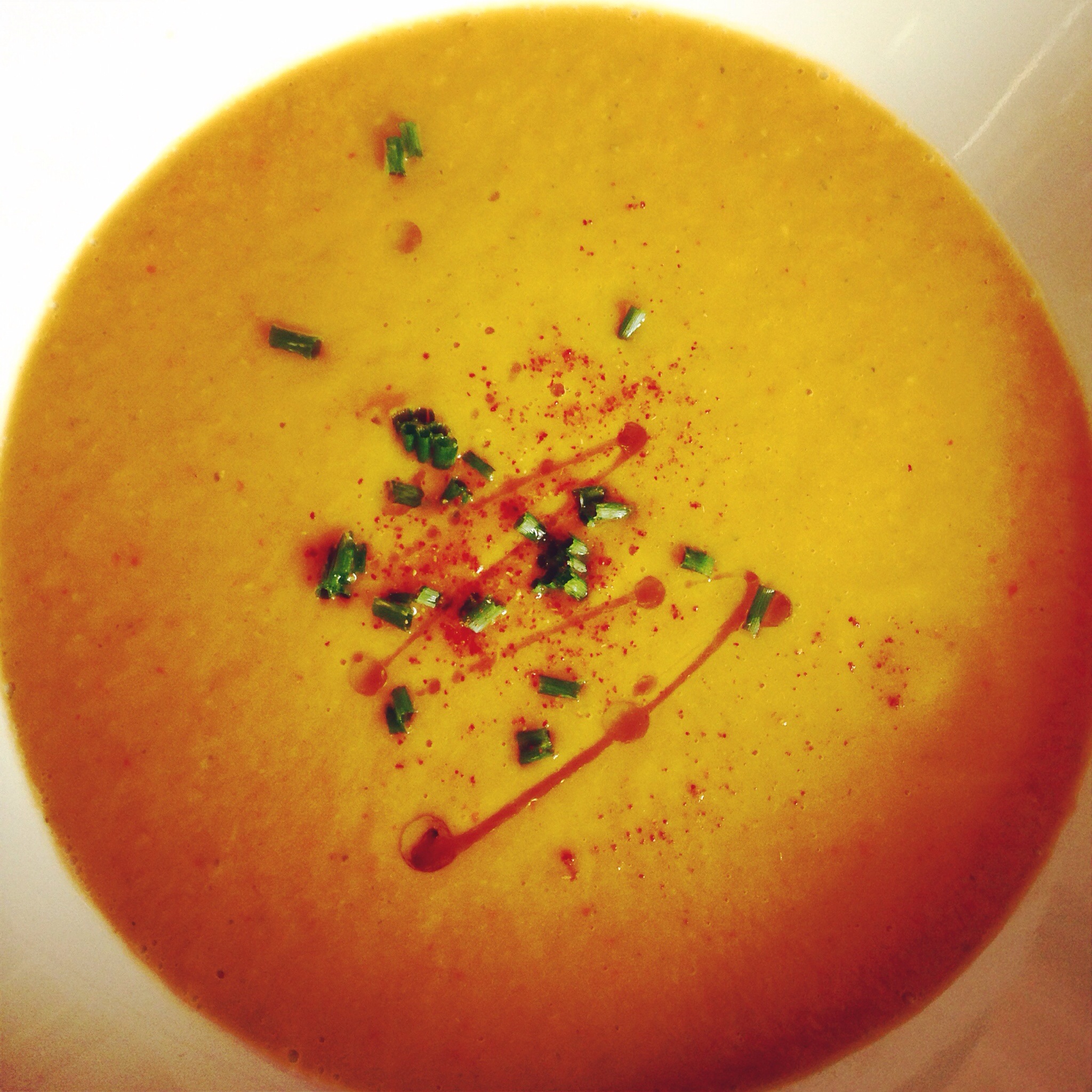 Heat a tablespoon of coconut oil and gently fry the onion before adding the coriander and garlic. When soft but not coloured add the sweet potato and red pepper, mix well and cover with the veg stock. Once the potatoes are soft add 1/2 can coconut milk and blend. I use a Vitamix but a hand held blender will work well too.