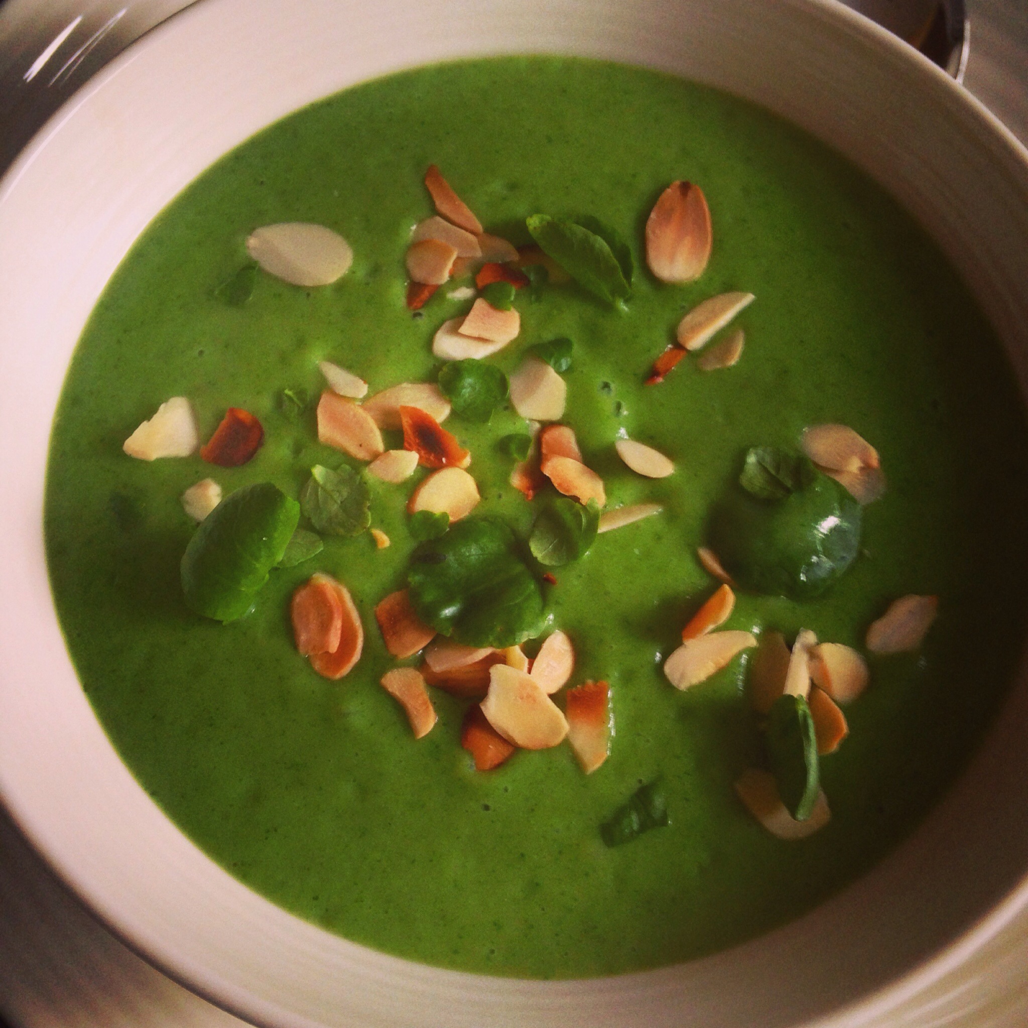 After cooking for 20/25 minutes put the clean watercress in a blender (I use a Vitamix), add the cooked vegetables with some of the liquid and blend adding more liquid if needed. Add salt and pepper if needed and serve with toasted almonds and a few watercress leaves.